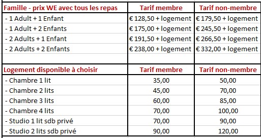 Contribution : Les prix mentionnés incluent tous les frais pour les deux jours, il faut ajouter la chambre ou studio de votre choix. Possibilité de location de draps à 10€ le set. Vous êtes libre d'apporter votre/vos propre(s) lit(s) pliant(s) pour les enfants.