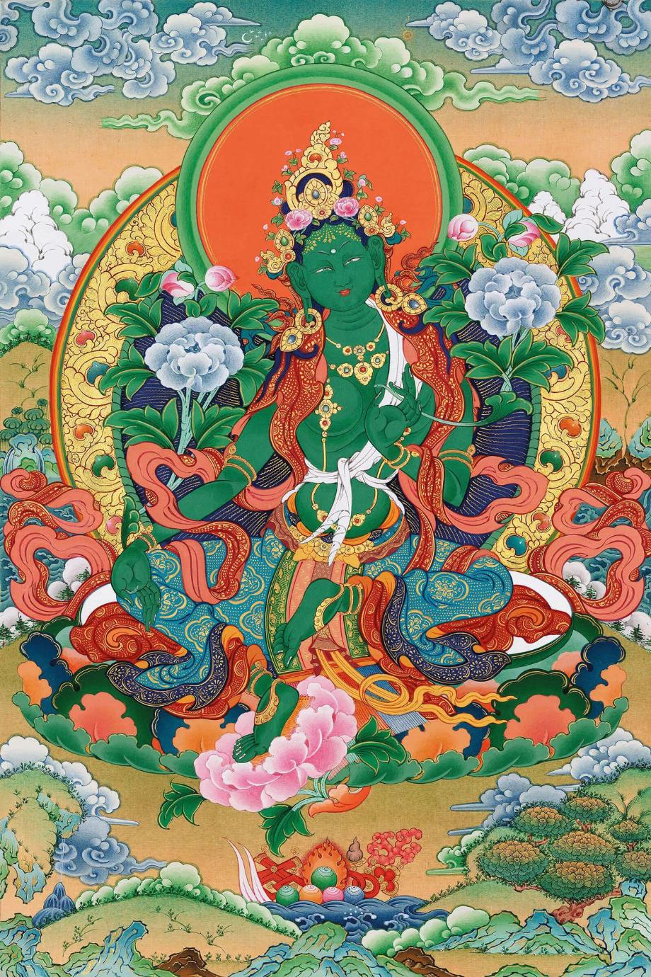 Dans le bouddhisme tibétain, il existe 21 Taras qui sont les manifestations féminines de l'esprit de tous les bouddhas. Elles contiennent toutes l'essence de Chenrézi, le Bodhisattva de la compassion. L'une des plus célèbres est la Tara verte. Elle apparaît comme une femme gracieuse au visage souriant. Elle symbolise l’amour bienveillant et représente le pouvoir qui libère de toutes les peurs et protège du danger. Elle est connue pour ses interventions rapides et immédiates. Elle soumet également les démons, dissipe les mauvais rêves et apaise les querelles.